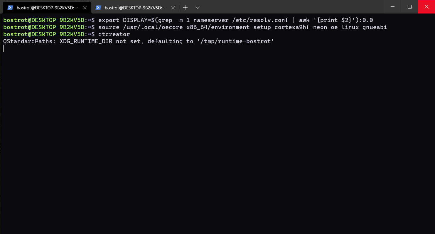 | Now we could try to start it but it will only show errors as there is currently no display connected. In order to get a display working, we can install an xserver variant on windows. I used VcXsrv as it includes creating firewall entries automatically. You can find the source [here](/p/d8013e24-f288-4384-8c2e-7386aeaa9a0f/VcXsrv%20Windows%20X%20Server%20download%20 | %20SourceForge.net). After installing, start it with XLaunch, accept the firewall entries (if prompted) and go through the setup: display number: 0, Start no client and select Disable access control. Now you should be good to go back to the WSL console and start qtcreator on your windows host with qtcreator: |