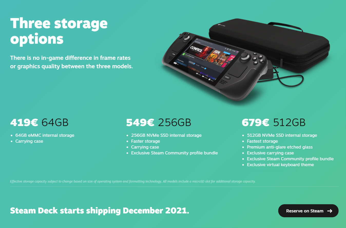 The Steam Deck will come in three different storage versions: 64GB, 256GB and 512GB with high price jumps in between.