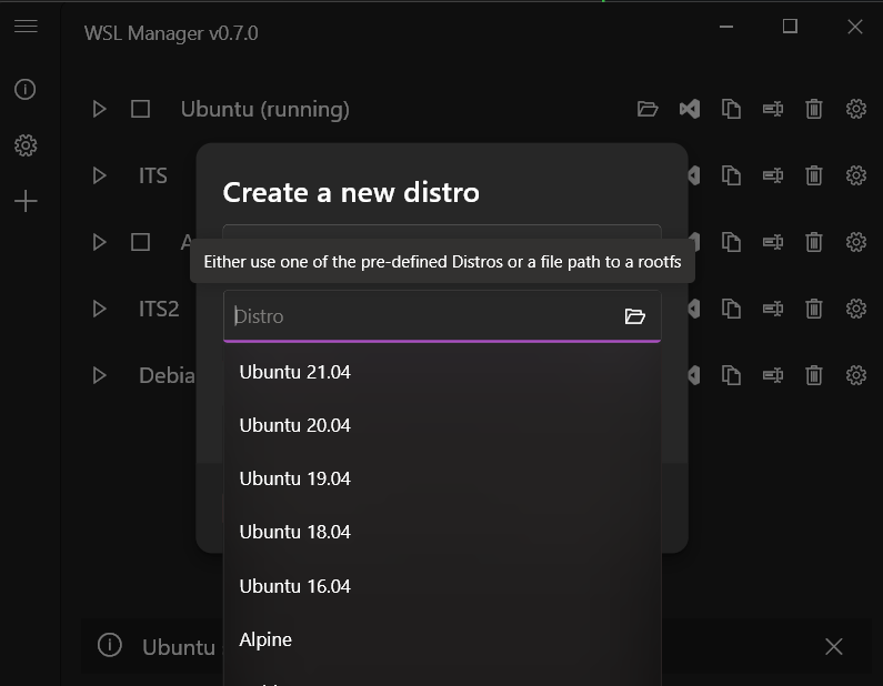 Interestingly Windows does not allow you to install a specific distro twice with their install command. So when you want to create a second instance with the same distro you would actually have to use a rootfs. I automated that process in my tool so it actually downloads the rootfs first into a cache and then re-uses it for new instances. This also allows adding more distros quickly in the future without relying on the Windows Store to update theirs.